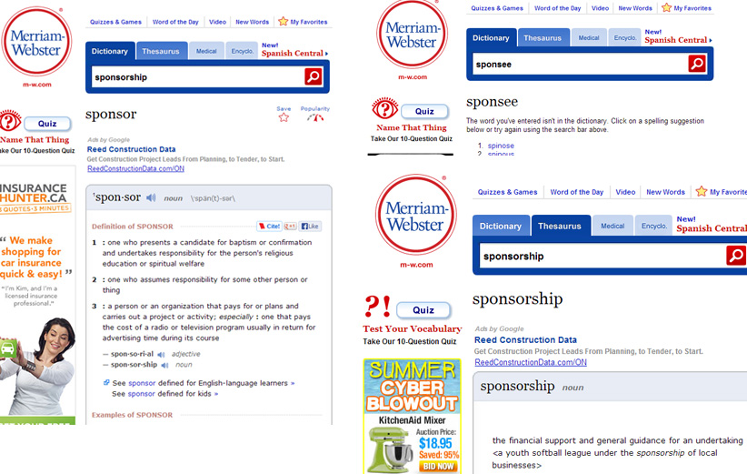 Next step was to look up the formal definition of “sponsorship” using Mirriam-Webster’s online dictionary, but since sponsorship is technically a noun, I was directed to the definition for “Sponsor”. According to this dictionary, “Sponsee”, isn’t a word so no luck there, either. I then hit the thesaurus button and got something close: “the financial support and general guidance for an undertaking ”. Not really what I was expecting, but then again, there are a number of marketing terms that technically don’t reside in a traditional dictionary. I decided to look at a more modern source including industry juggernaut: IEG, Wikipedia and one from Europe: